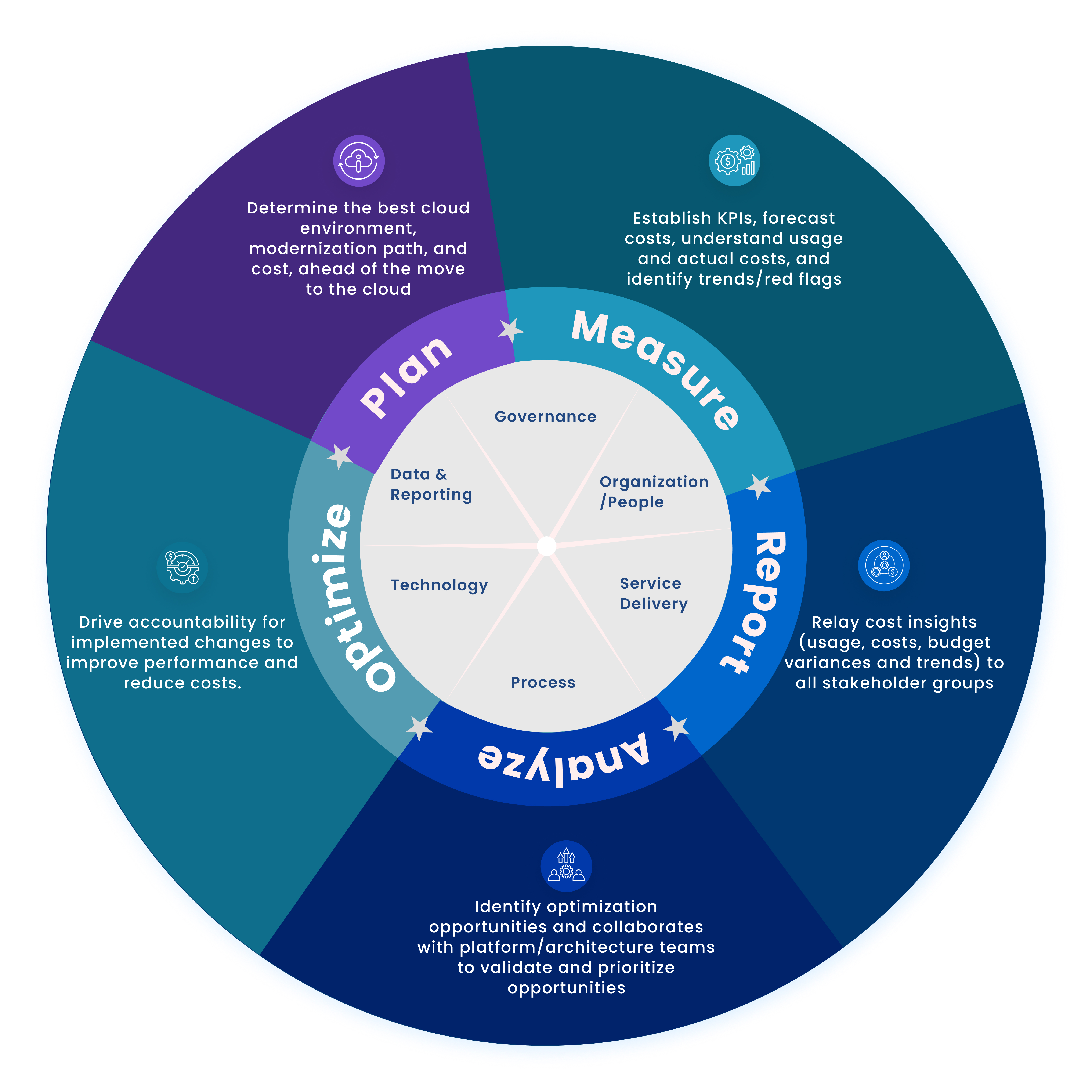 - Relay cost insights (usage, costs, budget variances and trends) to all stakeholder groups.